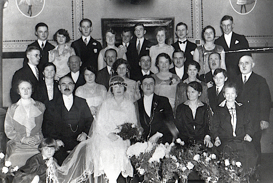 Hochzeit in der Familie Sablitzki, der Sohn einer Schwester meiner Urgroßmutter Marie heiratet. Allerdings hat sich meine Urgroßmutter danach mit ihrer Schwester wohl so zerschritten, dass sie nicht mehr mit ihr zusammen auf einem Bild sein wollte. Aufnahme ca. 1924.